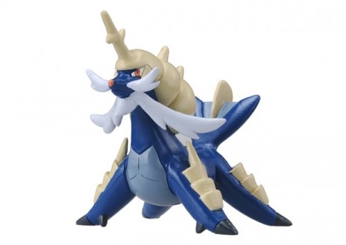 Takaratomy Pokemon Black and White Monster Collection Figure - M-020 - Daikenki/Samurott Description:Daikenki is a quadruped, blue sea lion-like Pok�mon. Long, white whiskers extend from its snout and head, and on the back of its head is a large, rounded beige helmet-like shell with spikes and a spear-like, pointed protrusion in the front. Its underbelly is covered by a dull bluish gray seashell-like carapace, and its limbs are covered with beige, sectioned bracer-like coverings, looking as if comprised of seashells with the forelimbs' bracers being the swords that it uses in battle. The lower two segments of these bracers are the scabbards for the two swords. The upper segment and spike make up the sword and its handle, respectively. Daikenki possess three navy digits on each limb, and a fin-like, splayed tail with the innermost section being beige like the seashell-like portions of its body.